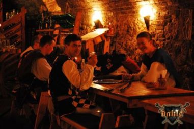 ... a Várba ( ahogy ígértük visszatértünk ) ahol a program ismét csúszik, nyugodtan oda pakoltunk a színpad oldalához a hűvösbe, ma se kímélt minket a nap ... Csak SÜT- mi meg FŐVÜNK, pedig nem is gasztronómiai találkozóra jöttünk! Nem lesz ennek jó vége ...J No de legalább Máté barátunk itt van velünk, kitárgyaljuk a reggeli vizsgálatokból mi mindenre figyeltünk oda, és hogy Gabó ”vasedényen” nem tudott eluralkodni a Koponya hatalma, de Hami agysejtjei menthetetlenek! Na ja Gabót tegnap a 40 0C-ba még sikerült lebeszélni a Full vasról no de mára már ez csak a láncing hiányát jelentette ez pedig nem túl nagy könnyebbség! Fellépés ma osztott lesz beépülünk a másik egyesület műsorának közepébe! Csak előbb Őrségváltás a várban, ezt folyton a házigazda adja és ez igazi profi őrség!!! – elismerésünk jeléül egyvonalban állva kivont karddal tisztelegve köszöntjük az eseményt. Ezután kezdődhet a közös műsor. Jól sikerült ez is, mint eddig minden, lesz ennek még böjtje! Pakolás az autóhoz ... Máté segít nekünk cipekedik hozza a buzogányokat, milyen jó fej és erős... ja és önálló hisz nem szólt senkinek hogy odajön hozzánk ... kb. 2 órája már hogy velünk van, még szerencse hogy Nelli szólt Kingának, így nem volt idegeskedés. Máté épségben visszaért büféhez, ahol ismét ittunk egy capuccinot, és beszélgettünk. Tudtam mindig hogy, Csíkos is könnyen elfogadtatja, sőt megszeretteti magát bárhol, nem is csalódtam, már fél Eger az ismerőse! Így nem meglepő hogy, Peták a Panoptikum királya és tárlatvezetője, aki egyébként régi Egri Vitézlő Oskolás, ezermester és a többi... szóval szenzációs figura meghívott minket másnapra, ha van érdeklődő egy sajátos kirándulásra, a Panoptikumba. Remélem sikerül eljutnunk, mert tutti hogy komoly élmény lesz! Közben a vihar elért Pestre is, de már nem olyan erős, mint Győrbe. Mondom én, mire ideér nem is lesz semmi belőle... vagy mégis estére szabadtéri asztalfoglalásunk van a Bíborosba, hisz tanulva a tegnapból most Nelli intézett két asztalt nekünk! Nem nevet! Persze hogy, székekkel együtt. No de még addig van egy jelenésünk Béláékkal a Széchenyi utcába a Művészetek Háza előtt párharcok... majd 18.40 - kor. Hol van az még, van idő kicsit kikapcsolódni, szétnézni itt a várba. Mondjuk megtekinteni a Borospincét, ez itt Egerbe szinte kötelező program, nekem meg pláne mert itt van az én drága Medinám ... nem nő ... bor, azon kevés vörösborok egyike amelyet tisztán is megiszok és semmi bajom nincs tőle ... maximum kicsit becsípek, de most csak egy pohárkával szabad inni mert még lesz jelenésem. Jó ez a hely kellemes környezet remek borok, na és jó csapat ez annyira jó, hogy valami tutti belerondít, naná hogy nem úszom meg, itt is kollégákba futok, civil ruhás ellenőrzés, itt minden rendbe van így haladnak is tovább mi pedig végre eltölthettünk egy kellemes félórát itt együtt a kis csapat, én, és persze a borok. Idő közben az idő kicsit enyhült és szelesedett, nem vészes csak nincs hőség! Nyomás a szállásra készülni az esti jelenésre...