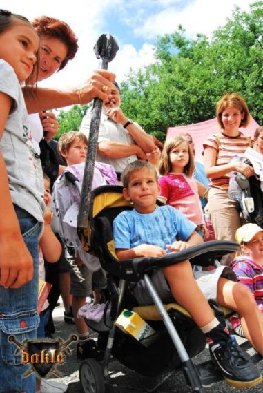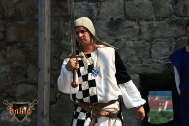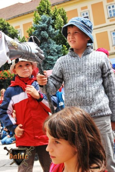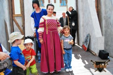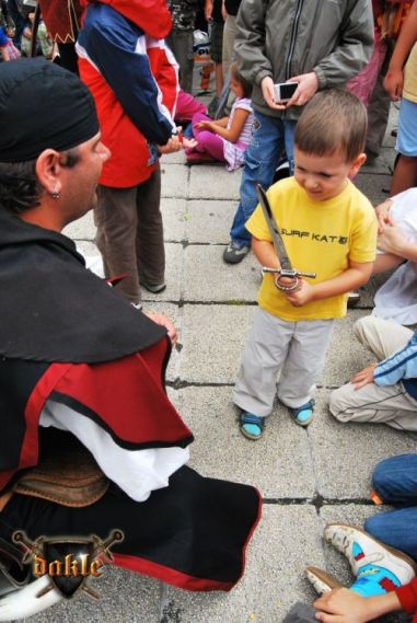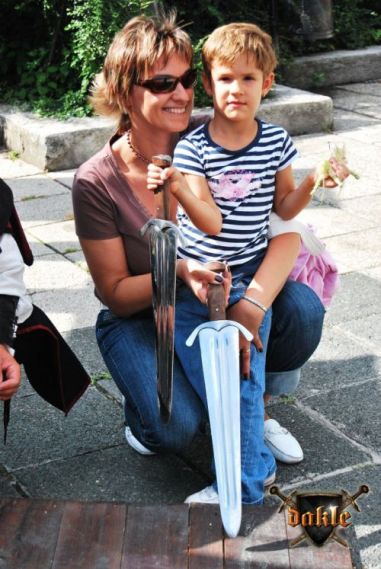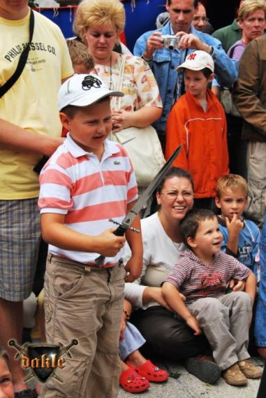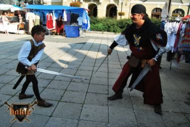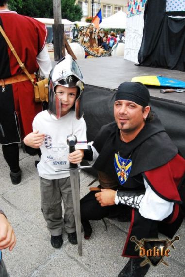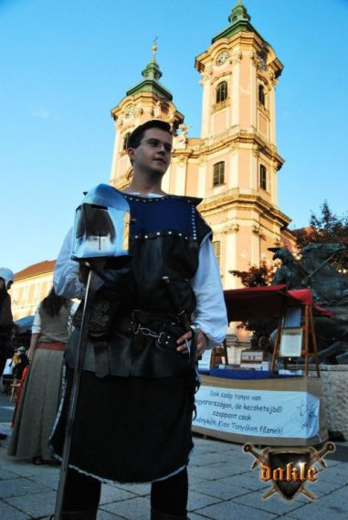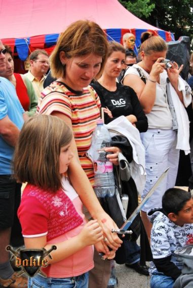 Szia Ádám! Bővült a csapat Megvannak Ádámék is! És az első rosszhír is Pici barátunk bár megérkezett Egerbe és be is öltözött, sőt meg is jelent a Dobó téren, de később rosszul lett a hasi fájdalmaknak pedig mint tudjuk korház lett a vége remélem azóta már jó van. No de térjünk csak vissza a Várba. Az hogy persze lefelé rohanás volt a szállástól az csak természetes, így igazából nem is említeném... Elkésünk, elkésünk ... Várnunk kell mert csúszik a program először de nem utoljára!!! No azért a fegyverbemutatónk a nap fénypontja kisebb csata jelenetekkel spékelve csak Gabó hiányzik,ő viszont nagyon a full páncél ebben a potom 40 0C-ba milyen jó is lenne ... ! Azért parádés volt! Aki látta örülhetett! De még fújni sincs idő mert már a Dobó térre cuccolhatunk is lefelé. Félúton egy kislány kivetette háloját a mi kis üdvöskénkre Bálintra. Soha nem lehet elég korán kezdeni!!! Párbaj Béláékkal!