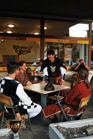 No nem Béláék ellen, hanem a jól megszokott rendben. I. és II .és persze III. jaaaaa és szerintem IV. Béla is ott volt, nos ők a párbajkódexnek megfelelő technikákat mutattak be míg mi ezt beültettük a tőlünk megszokott formába és végre egymásnak estünk!!! Nagyon jó volt, kisebb segítséget is kaptunk Károlytól, meg Róberttől, és a vezérüktől Károly Róberttől! Na szóval 3 fő a Károly Róbert egyesületből akikkel már az első nap kialakult a jó viszony ( ők vonultak mögöttünk, róluk írtam ! ) segítettek látványosabbá tenni a műsorunk. Ezúttal is köszi nekik, ....meg szeretném még megköszönni a szüleimnek meg a postásnak meg a kiskutyáknak, .... jaaa ez még nem az Oscar Díj átvételére írt szövegem?!? A párharcok és a műsor remek volt a dögmelegbe azonban csak kevesen láthatták ahogy brillíroztunk. De ahogy ez lenni szokót megint nem volt túl sok idő örülnünk! Még egy óra, és ismét félóra őrség aztán jól is leszünk! A maradék 45 percet ami az őrségig még volt a belvárosi nézelődéssel ütöttem el amelyhez Dönizke az őr társam is csatlakozott! Megnéztük a sétálóutcákat, kis sikátorokat, a Széchenyi utcát, ami a 3. helyszíne volt a programnak, no és a bazilikát... ugye milyen sok minden fér bele 45 percbe... vagy mégse jaajjj idő ... Persze Dönizke Imádkozni van a Bazilikába, oda karddal nem illik bemenni, most hogy csináljam, szólnom kell mert elkésünk, és persze Csíkosékat váltjuk aki amúgy is precíz mint egy német mérnök!!! Kard letesz bent az első padra majd irány a Bazilika másik vége ahol Dönizke nyugodt imát mond, mire előre értem épp befejezte és indult kifelé ... némi biztatással a tekintettembe ránéztem és értett belőle mert sietősre vette rögtön... Kard vissza a hüvelybe a szembe érkezők megdöbbenésére! Futás a térre épp a térre értünk mikor ütötte a felet az óra így 1-2 perc késéssel sikerült váltanunk a főkapunál! A váltásunkat fegyverrel kellett elűzni, hogy eredjenek má’ dolgukra! Minden perce élmény volt még az őrségnek is! Nem sok egy félóra, amikor azt néztem!!!!
